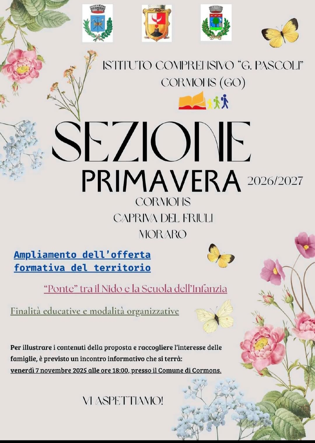 Il nostro Istituto Comprensivo vuole proporre un ampliamento dell'Offerta Formativa sul territorio dei comuni di Cormòns, Capriva del Friuli e Moraro mediante l'istituzione di una cosiddetta Sezione Primavera, ossia una classe "ponte" tra il Nido e la Scuola dell'Infanzia dedicata a bambine e bambini di età compresa tra 24 e 36 mesi.